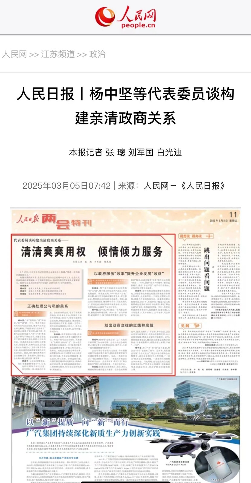 标题《人民日报丨杨中坚等代表委员谈构建亲清政商关系》进行转载。