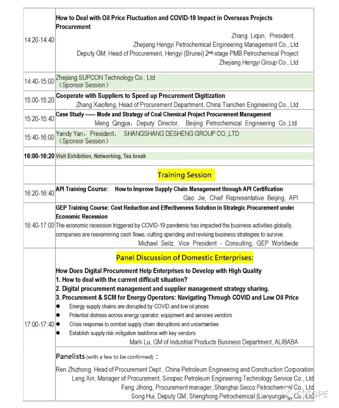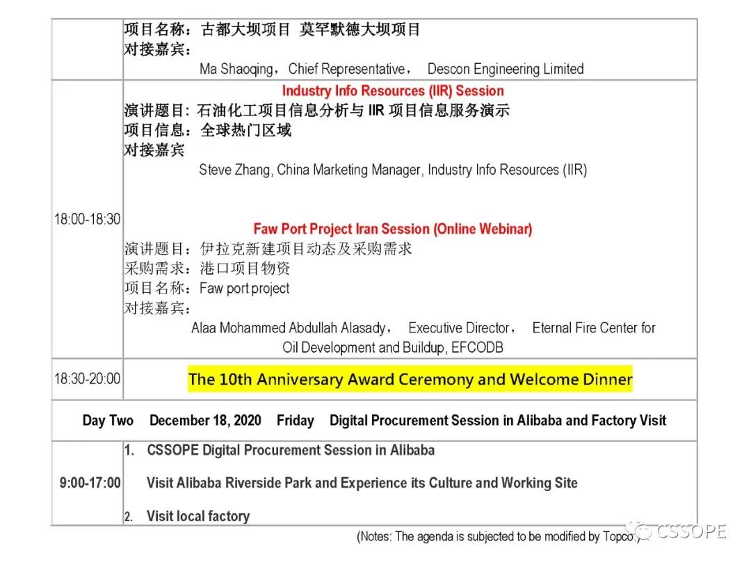 近日,阿美、SABIC、挪威国油、巴斯夫、朗盛、三大油、万华、恒逸、福陆、林德、三星、派特法、斯伦贝谢、DESCON、力拓、拉森特博洛、天辰、惠生、巨涛等众多知名企业的采购高层和企业责人确认参与CSSOPE,与来自全球的油气采购商及优秀供应商分享疫情与低油价影响下如何加快采购数字化转型和高效供应链管理模式,以推动行业复苏。大会精彩内容包括:国际采购专场、国内采购专场、采购培训专场、全球采购商与中国供应商线上交流专场、供采双方一对一交流环节、林德工程采购对接专场、三星工程采购对接专场、格瑞克集团采购对接专场、巴基斯坦DESCON工程有限公司采购对接专场、环球工业信息资源公司专场、伊拉克新建港口采购对接专场等,更有精彩的国外企业采购小组讨论及国内采购小组讨论、十周年颁奖庆典暨欢迎晚宴、阿里巴巴专场交流及工厂参观等精彩互动交流环节。