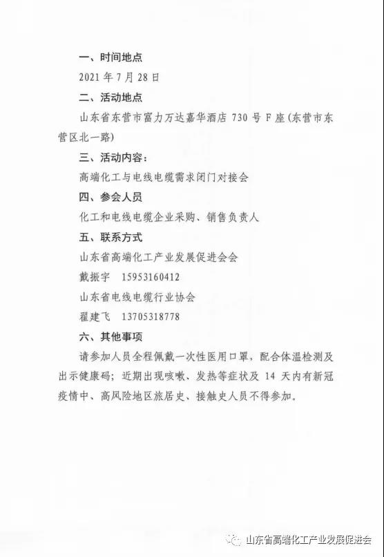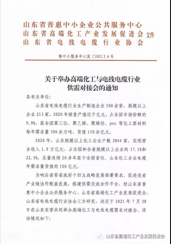 另外活动期间由省普惠中小企业服务中心、省电线电缆协会和促进会三家联合举办化工与电缆行业需求对接会,山东省电缆行业每年需求聚氯乙烯、聚烯烃、聚乙烯、硅橡胶、乙丙橡胶、无纺布、pvc等化工原材料货值100亿人民币以上,欢迎有相关产品或计划上此类产品的化工企业前来沟通交流。