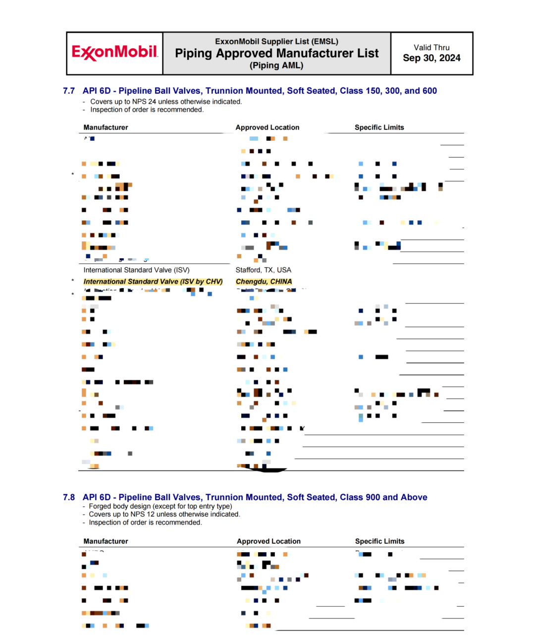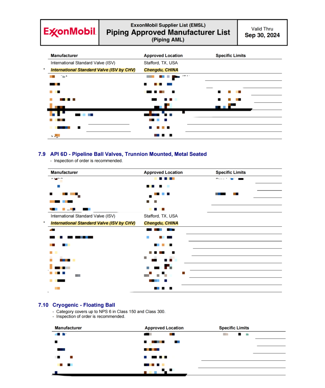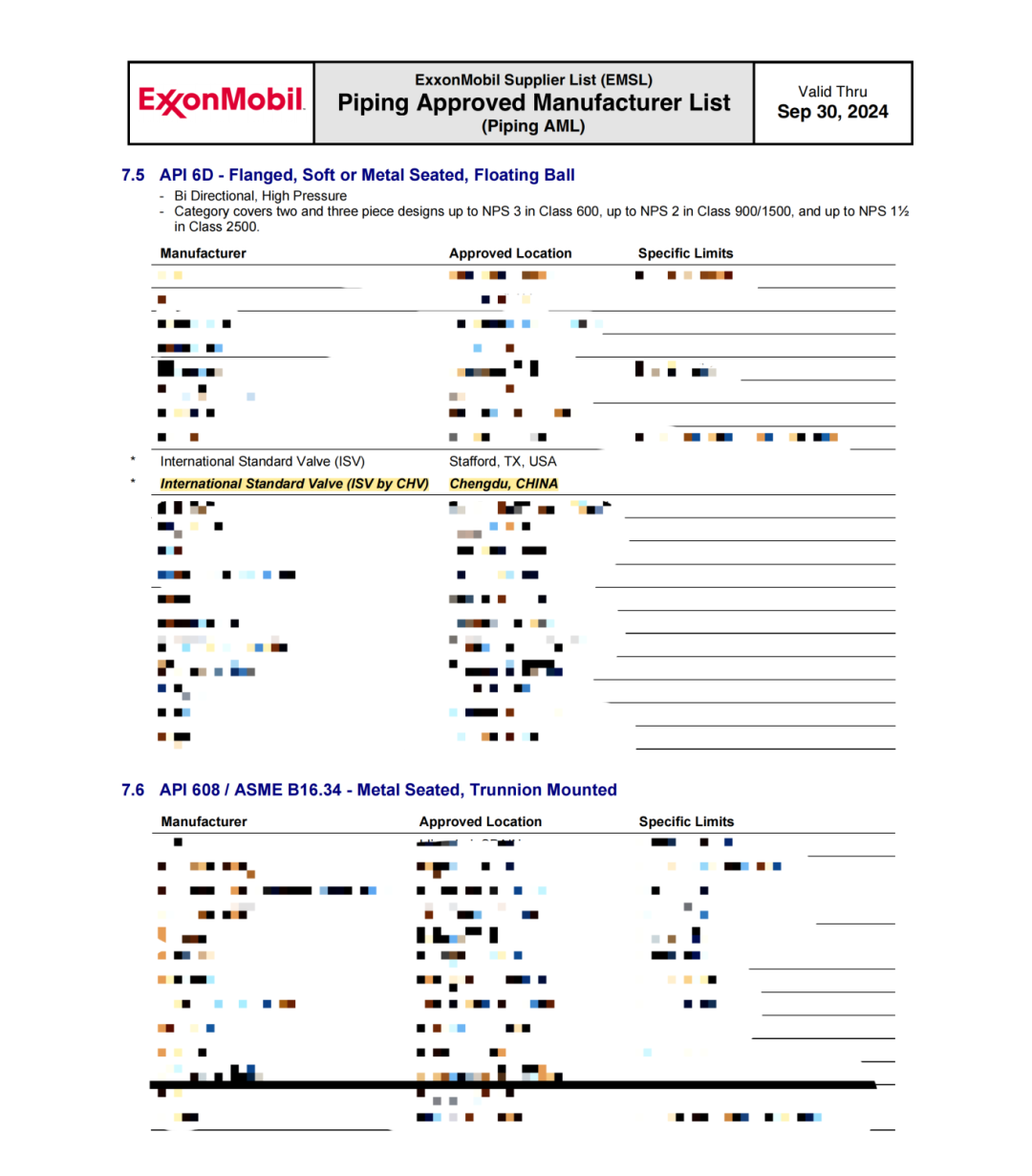 在美国埃克森美孚(ExxonMobil)最新发布的批准供应商列表(AML)中,成都成高阀门股份有限公司(CHV)在以下产品分类中获得正式批准:7.5 – A...