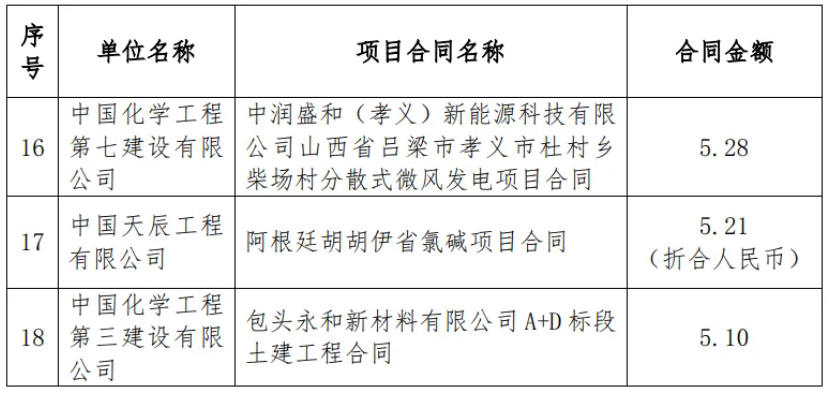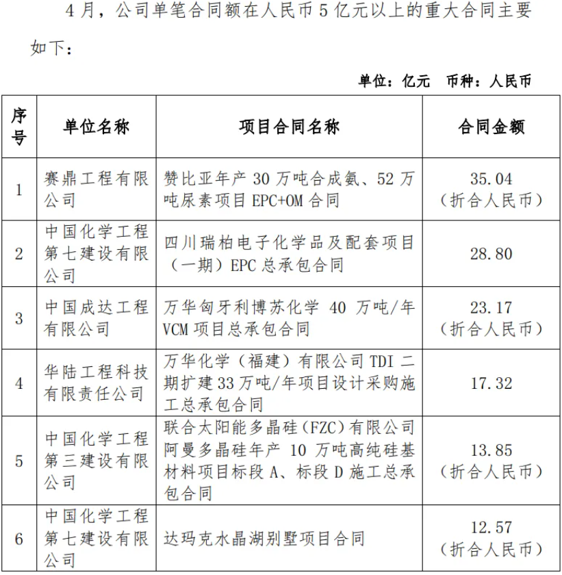 1-6月,中国化学共签订2749个项目,其中,单笔超过5亿元的项目有73个(具体清单见文章尾部),涉及包括万华化学、荣盛石化、湖北宜化、东粤化学、大全新能源、翔福新能源等多个巨头的项目,单笔最大金额高达81.8亿元,为中国五环在埃及签约的三期化肥项目总承包合同。