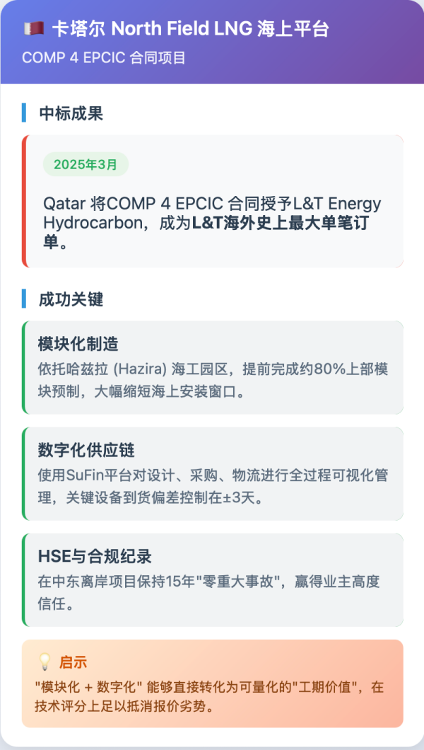 印度承包商Larsen&Toubro(L&T)旗下海工子公司赢得NorthField LNG项目海上平台EPC合同,金额约18亿美元,工期42个月。这是该项目自2024年启动以来金额最大的单体包,也是L&T首次在超大型海上油气领域击败韩国HDEC、意大利Saipem等传统劲旅。