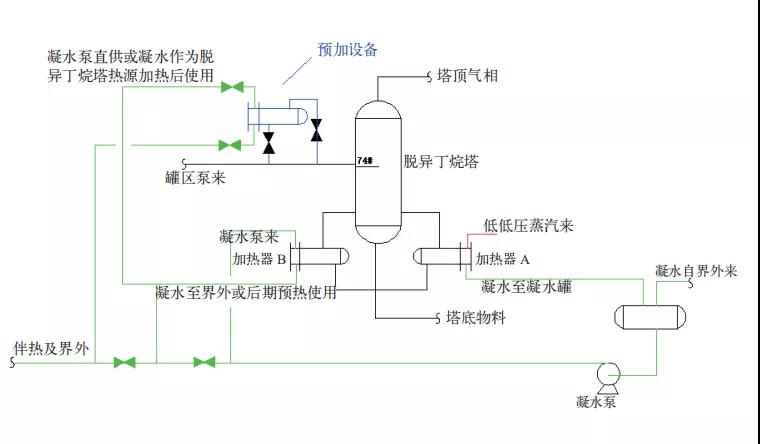 DIB 分离塔正常生产过程中热能耗损较大, 通过优化系统换热网络,充分利用塔釜加热蒸汽及系统管网凝液余热,综合降低系统生产运行热量损耗,减少能源浪费。