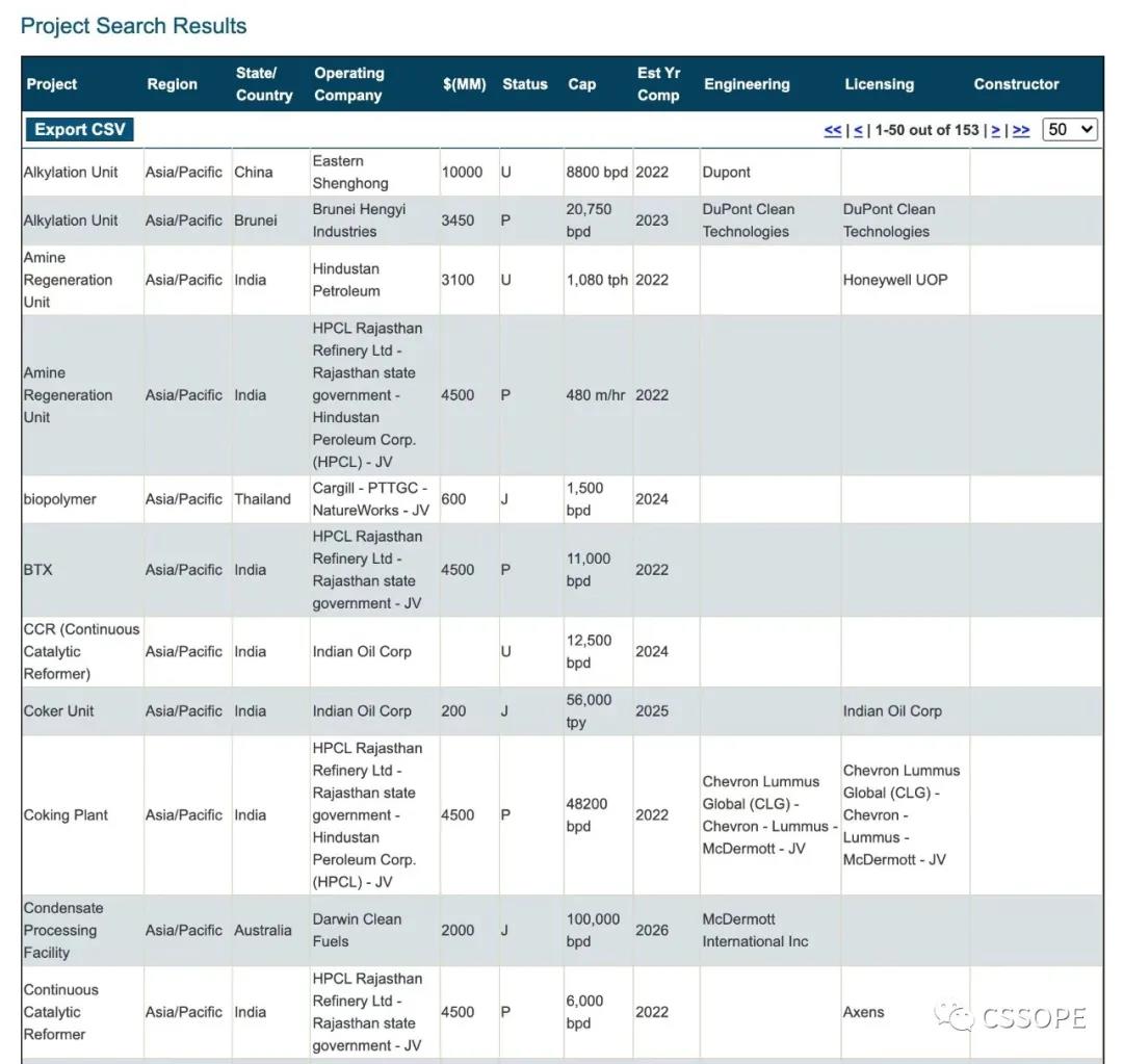据《烃加工》Boxscore Database亚太区负责人透露,目前数据库统计的亚太区拟在建炼厂项目总计153个。